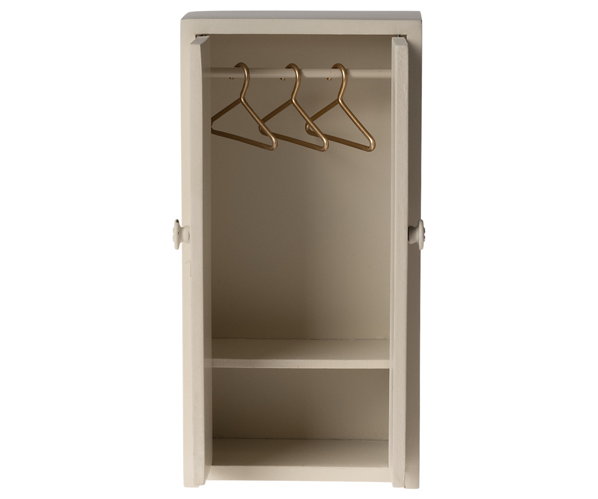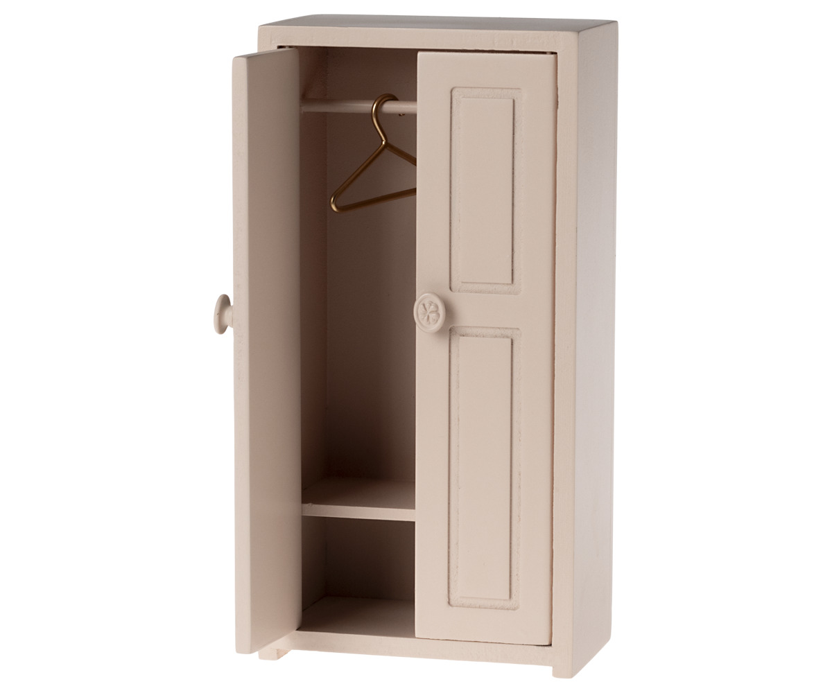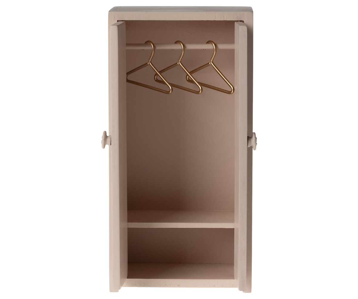 Un piccolo armadio aiuta la famiglia dei topi a organizzare il proprio guardaroba. L’armadio viene fornito con tre grucce dorate.