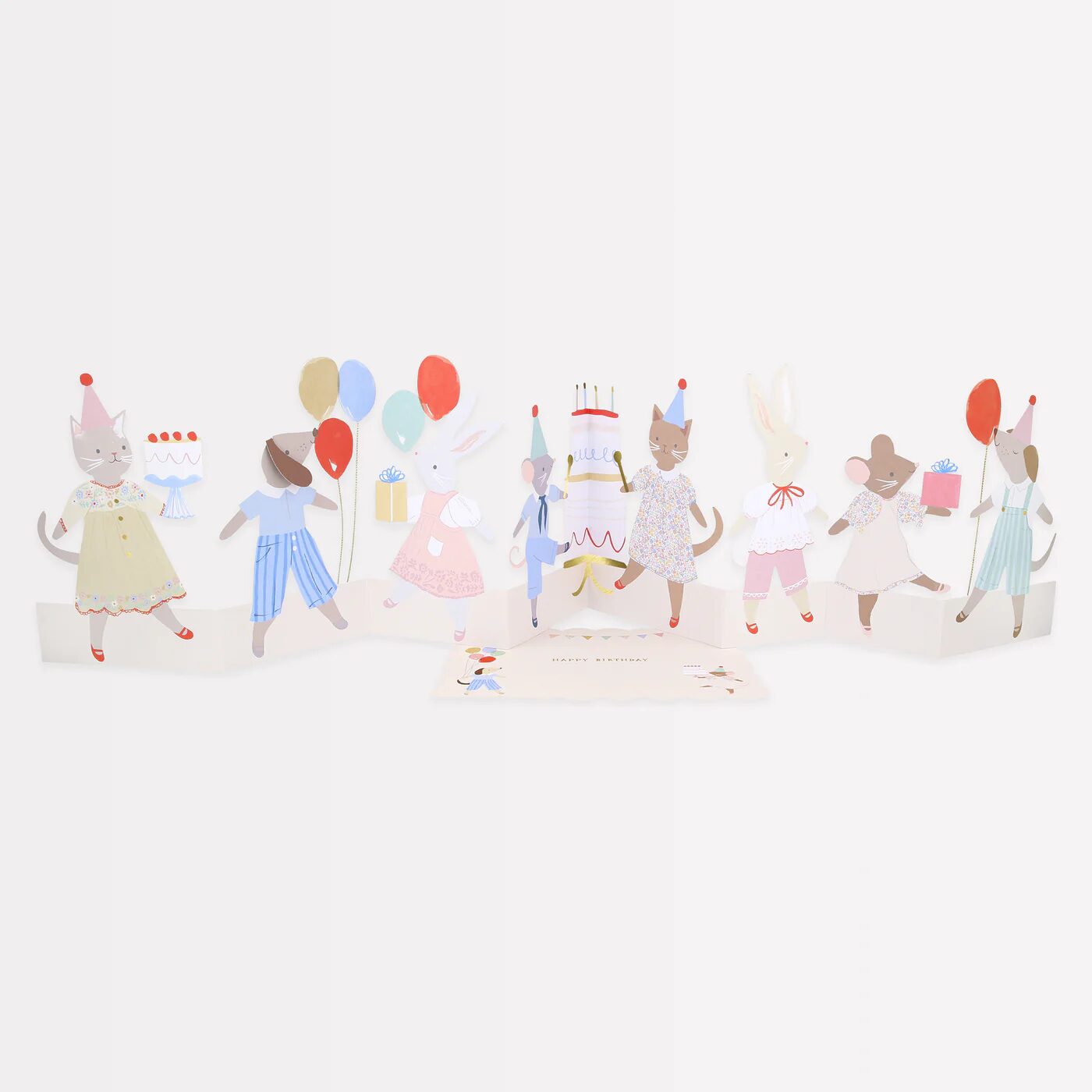 Adorabile allerta animale! Questo biglietto d’auguri è il modo perfetto per inviare i tuoi migliori auguri per i primi anni e i primi compleanni. Ispirato alle illustrazioni di moda vintage e alle palette di colori, con fili d’oro metallizzato lucido e tocchi di rosso per mantenere il look attuale. Questa carta a fisarmonica si apre per rivelare animali felici con palloncini in parata, ideali per decorare un davanzale, un tavolo o una mensola del camino, per riempire la stanza di gioia.