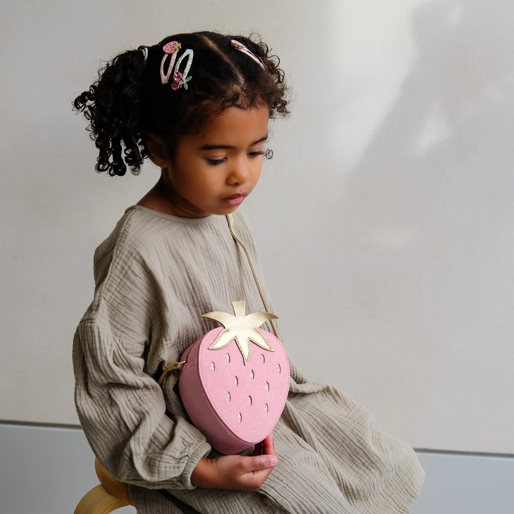 La mini borsa di fragole di Mimi & Lula è una piccola esplosione di dolcezza per la loro spalla! Realizzata con un tessuto rosa tenue con semi scintillanti e un gambo metallico dorato – perfetto per portare piccoli dolcetti o tesori nelle avventure estive!