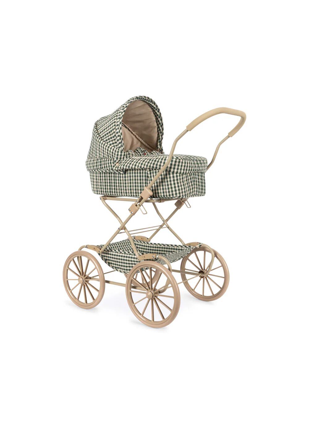 Carrozzina per bambole in stile vintage di Konges Slojd progettata con quattro grandi ruote realizzate in materiale EVA per una maggiore stabilità. Presenta tessuto stampato trapuntato e un materasso realizzato in cotone biologico al 100%. Progettato con un cestello portaoggetti morbidamente imbottito. Il telaio è in metallo con manici morbidi spugnosi. La carrozzina per bambole viene fornita completamente assemblata ed è facile da piegare e riporre.