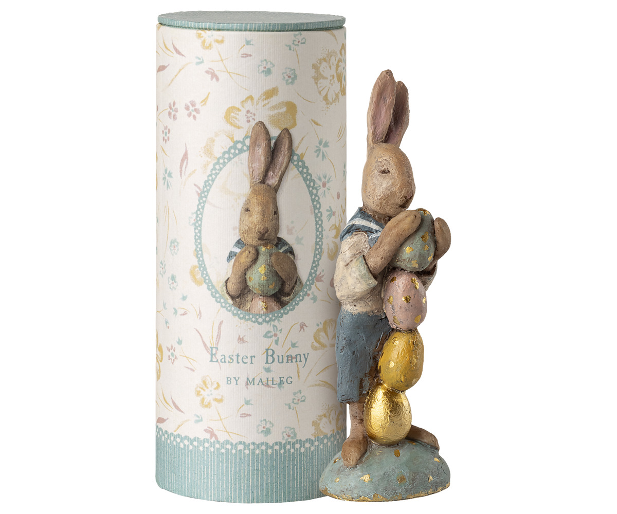 Immagina questo affascinante personaggio che adorna il tuo camino primaverile. Con una presa attenta sulla sua torre di uova scintillanti, il Coniglio di Pasqua di Maileg porta in casa un sussurro di meraviglia nostalgica e dolce celebrazione.