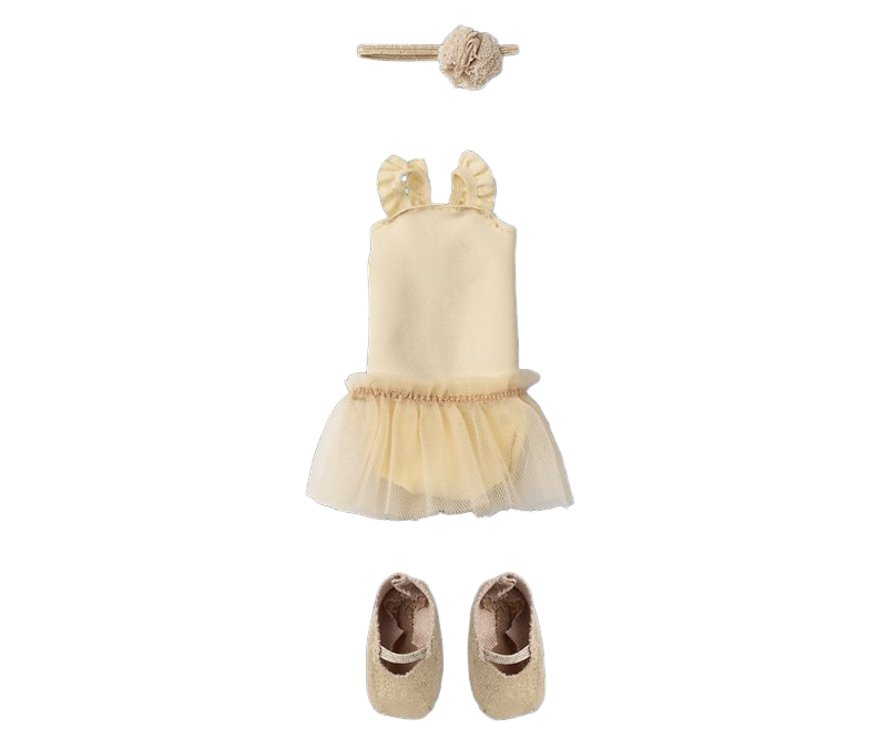 Il famoso coniglio Bunny di Maileg vestito da ballerina classica. Indossa un abito color bianco, una gonna di tulle e scarpe da ballo.