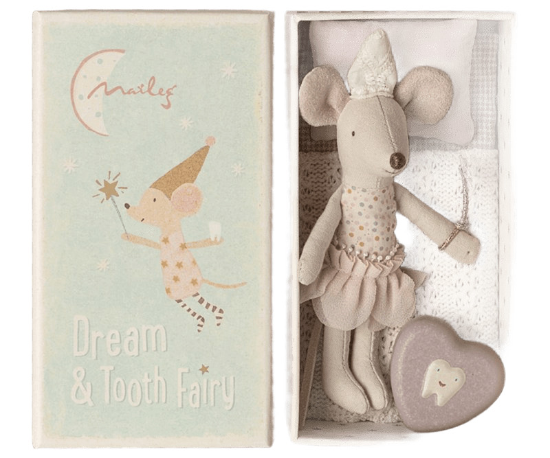 Di notte la fatina dei denti di Maileg sparge polvere di fata, raccoglie i denti e porta dolcetti e si assicura che tu faccia sogni d’oro. Vestito magicamente e dorme stretto in morbida biancheria da letto – include scatola per denti e scatola di fiammiferi.
