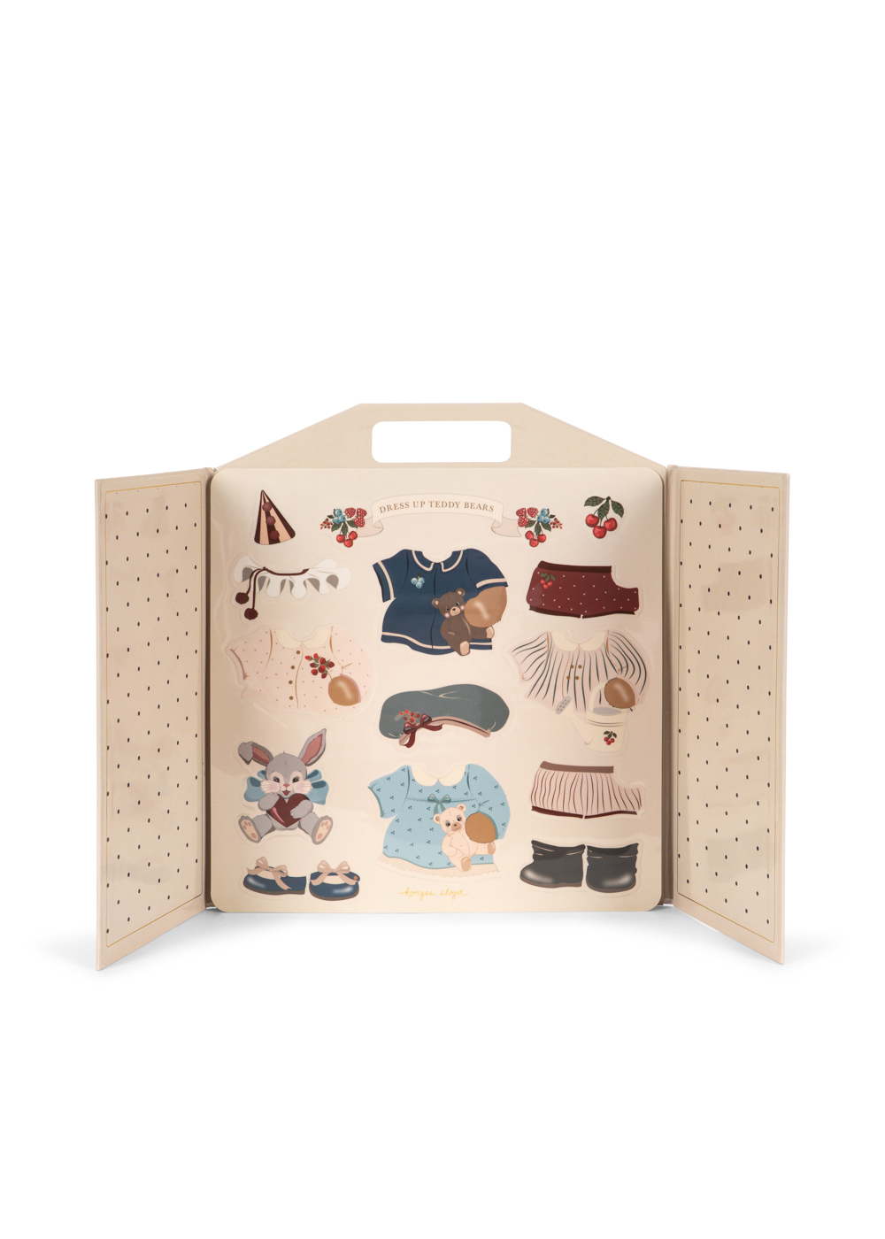 Un magico piccolo album di adesivi di Konges Slojd che ti invita a vestire i tuoi orsacchiotti preferiti con abiti carini. Realizzato con uno sfondo splendidamente illustrato e gli orsacchiotti più dolci che amano giocare a travestirsi. Attacca, sbuccia e attacca di nuovo – questi adesivi riutilizzabili sono fatti per ore di divertimento. Adatto a partire dai 3 anni+