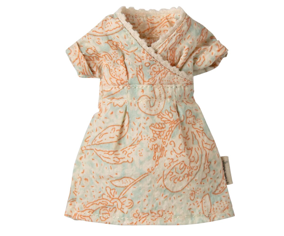 Mamma topo Maileg in un vestito leggero. Questo mouse si adatta a mobili e accessori in dimensioni mouse. Acquista più vestiti separatamente. I vestiti in taglia mamma/papà si adattano a questo topo