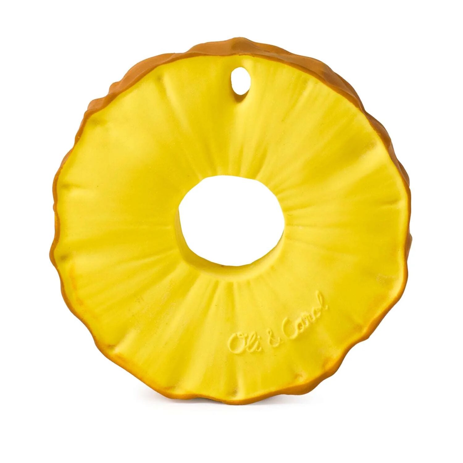 Succoso Succoso! Ananas the Pineapple di Oli and Carol è un giocattolo masticabile pensato per la dentizione, il bagnetto e il gioco sensoriale. Le sue texture realistiche come un ananas a fette e il suo foro centrale aiuteranno a stimolare i sensi dei bambini dentro e fuori dalla vasca da bagno, oltre a dare sollievo alle gengive durante la dentizione. Introduci i bambini a uno stile di vita sano con questo massaggiagengive alla frutta! – Questo massaggiagengive è facile da appendere a una cinghia e masticarlo mentre sei in movimento! – Consiglio salutare: sapevi che se ripianti la parte superiore tagliata di un ananas, questa diventerà una nuova pianta di ananas? Puoi raccoglierne uno tuo a casa!