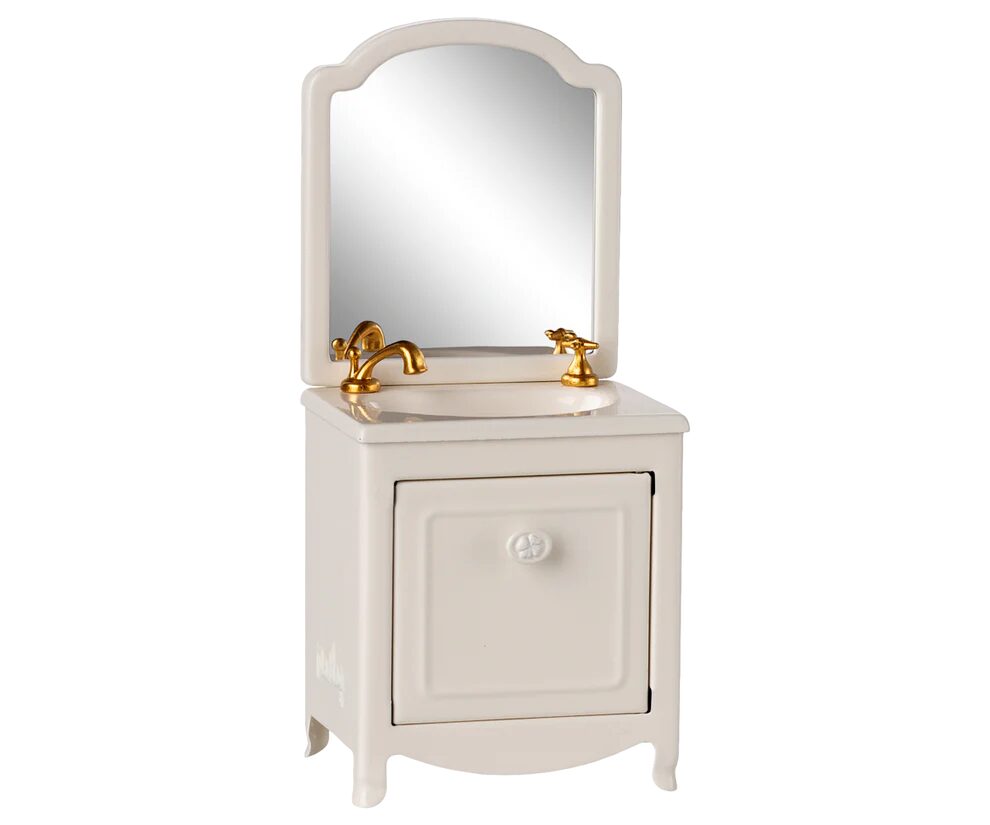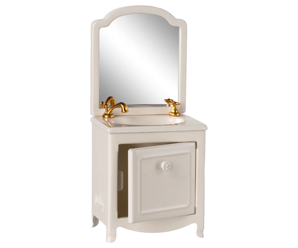 Un elemento molto essenziale per il bagno in Mouse Hole Farmhouse di Maileg. Ha un piccolo armadio sotto il lavandino e, naturalmente, anche uno specchio. Aggiungi il WC e la vasca da bagno Maileg per prolungare il gioco.
