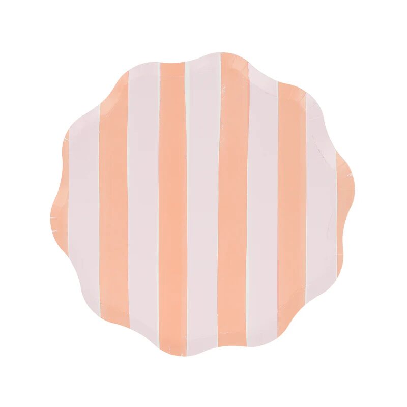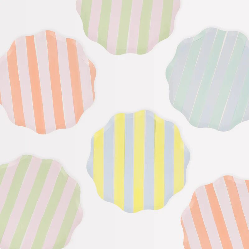 Le strisce di effetto dipinto nei pastelli freschi sono un’aggiunta divertente a qualsiasi festa. Usali in qualsiasi pasto speciale dove si desidera una spruzzata di colore morbido in un design senza tempo. Queste piastre laterali di carta, con un meraviglioso bordo ondulato, sono ideali per la stratificazione del tavolo. Fungeranno bene per feste da giardino, cocktail party, picnic, docce per bambini o ogni volta che vuoi un tocco di colore primaverile.
