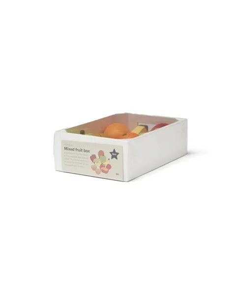 Una cassetta di legno con misto di frutta di Kid’s Concept. Banana, kiwi, fragole, mela, pera e arance. L’arancia e il kiwi possono essere divisi in due pezzi e rimessi insieme con il velcro. Realizzato in legno.