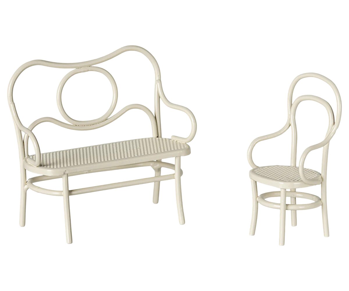 Mobili da caffè che si adattano ai topi sorellina/fratello minore e sorella/fratello maggiore. Il set è composto da una panca, una sedia e un tavolo, ed è un luogo perfetto per gustare i dolci pomeridiani.