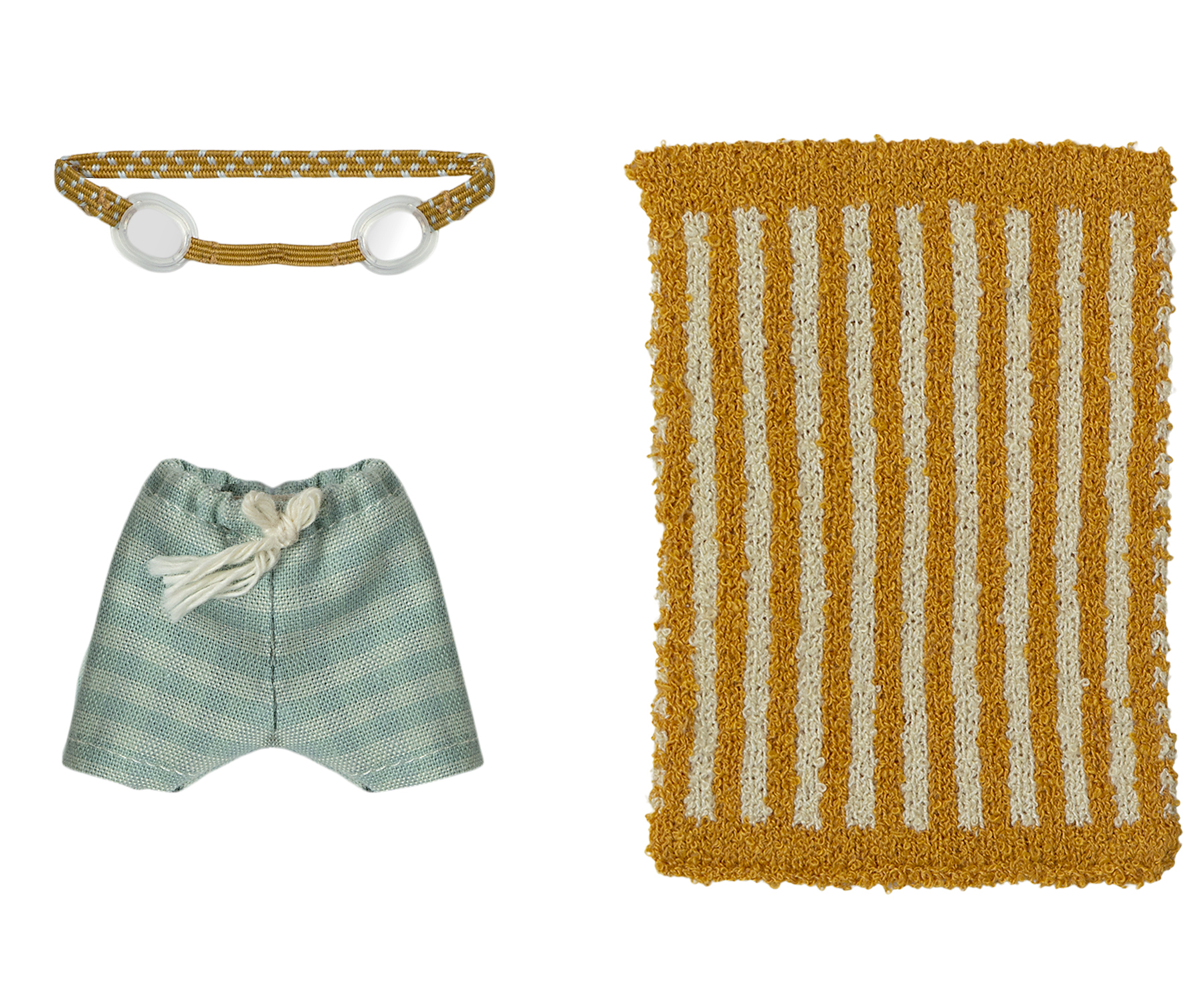 Ferie. Questo set include tutti gli accessori essenziali per una divertente giornata in spiaggia: calzoncini, occhialini e un asciugamano. Si adatta perfettamente ai topi della taglia grande fratello/sorella.