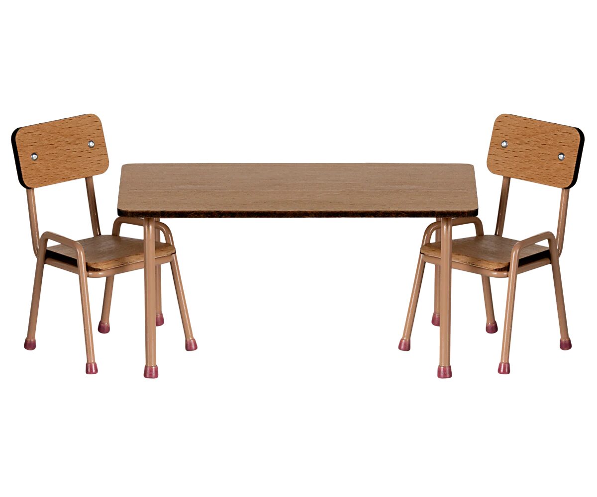 Set di tavolo e sedie di Maileg che si adatta alla fattoria Mouse hole. È realizzato in legno di faggio con gambe in metallo. Si prega di notare i dettagli colorati fatti a mano sui piedi delle gambe, sia sul tavolo che sulle sedie. Il set viene fornito con 2 sedie.