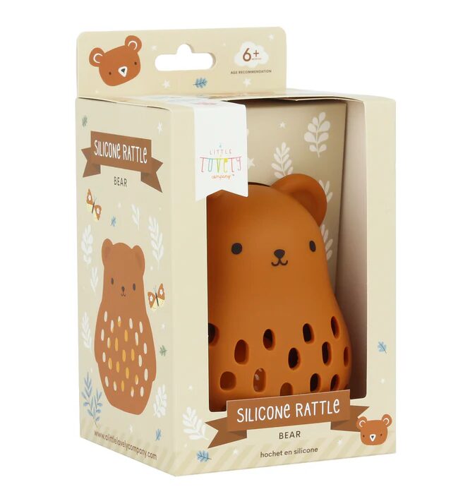 Questo adorabile sonaglio di a Little Lovely Company è realizzato in silicone morbido, flessibile e per uso alimentare, sicuro e delicato per i più piccoli da giocare e masticare. La parte inferiore del sonaglio è arrotondata, il che lo rende un divertente giocattolo rotolante. Perfetto come regalo di maternità o per qualsiasi baby shower.