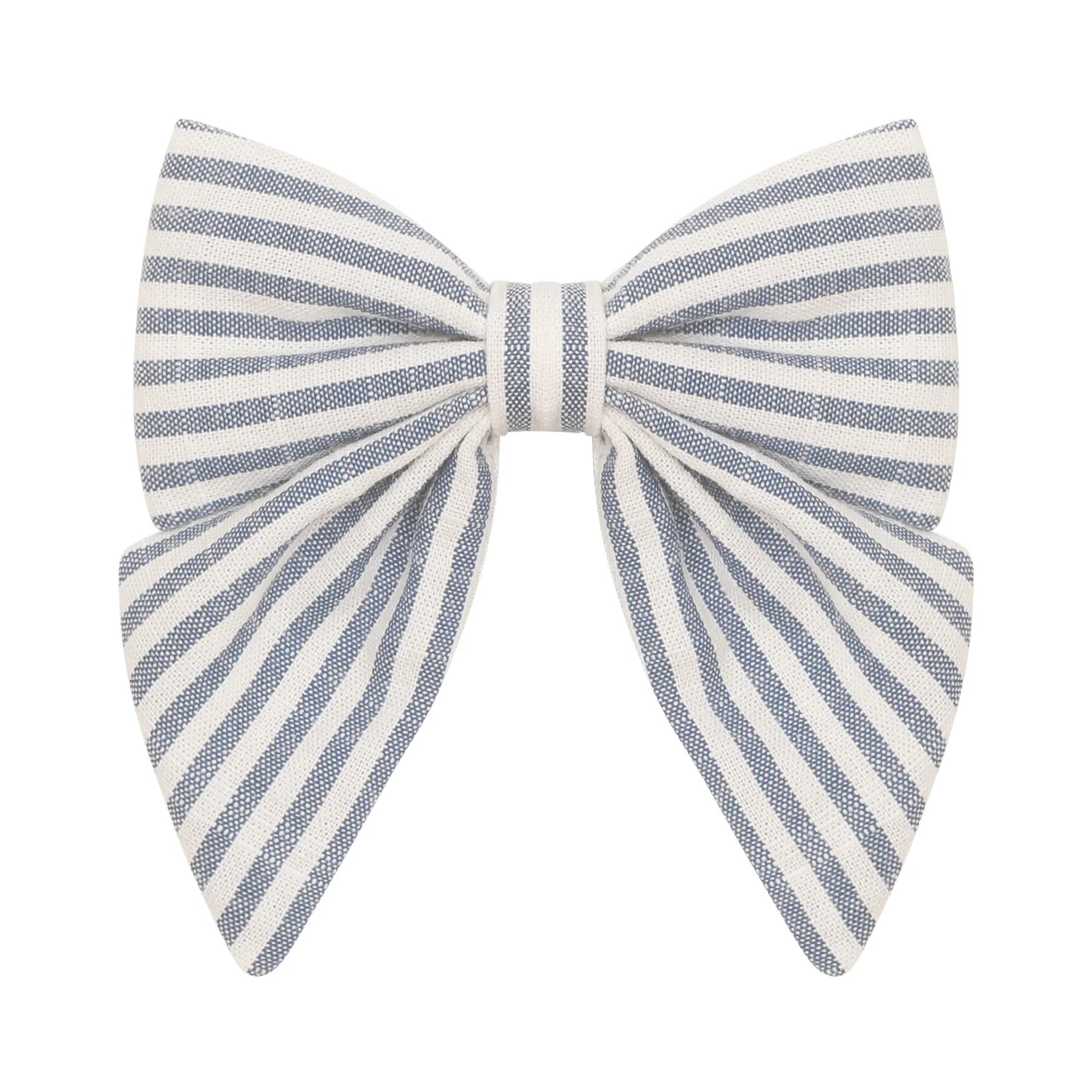 Fiocco legato a mano realizzato in morbidissimo tessuto a righe bianche e blu fissato a una clip a coccodrillo