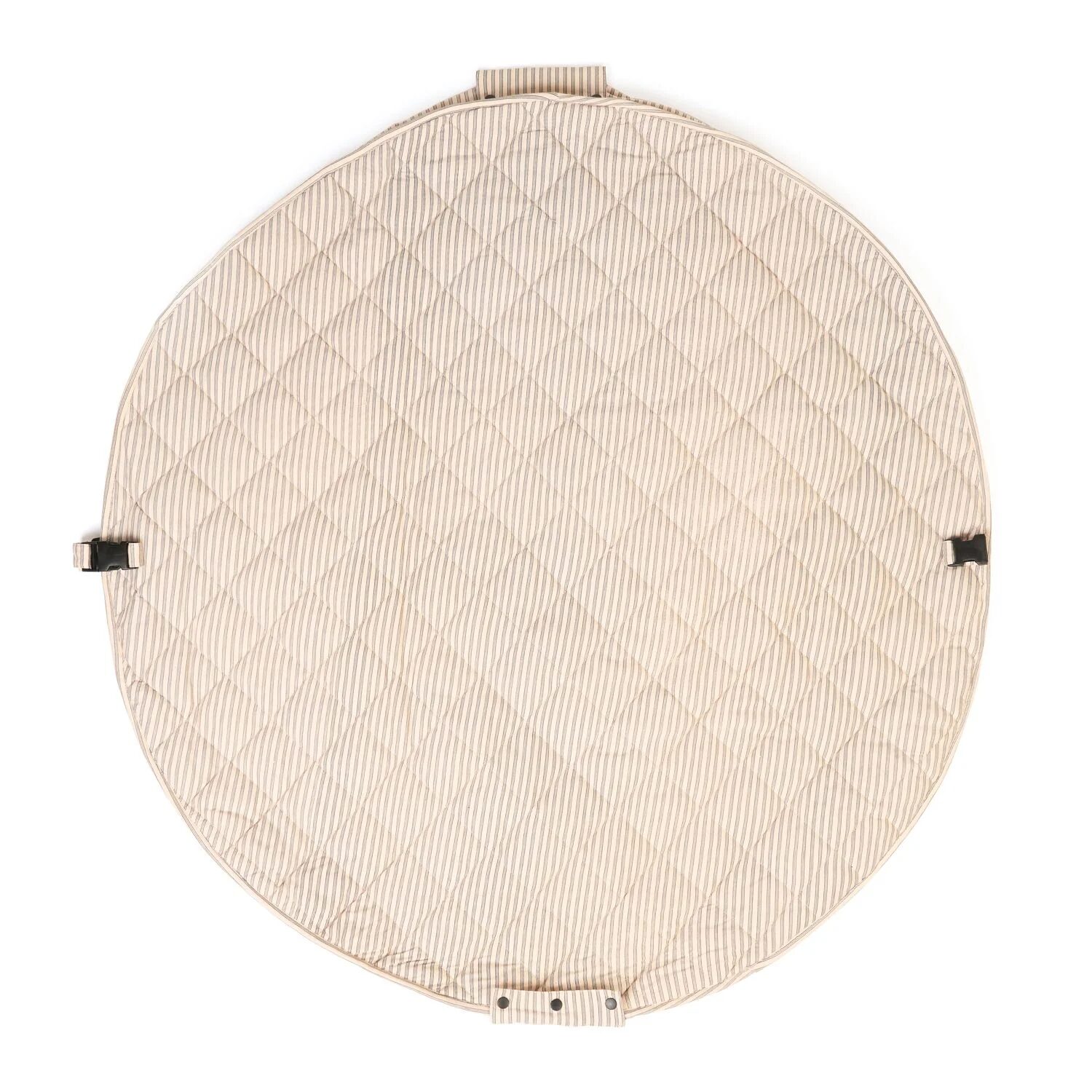 Esplora la versatilità del nostro tappetino da gioco imbottito per bambini sapientemente realizzato, ora arricchito dal design a strisce blu. Questo pezzo innovativo si trasforma facilmente in una borsa per giocattoli e in una borsa per pannolini, combinando la praticità con un tocco di eleganza contemporanea. Con un generoso diametro di 120 cm e realizzato in cotone biologico GOTS di altissima qualità, questo tappetino da gioco non solo offre un comfort superiore per il tuo bambino, ma supporta anche l’artigianato etico e sostenibile. Integrandosi perfettamente nella tua vita quotidiana, questo duo di tappetini e borsa per pannolini bilancia praticità, stile e il fascino sereno delle strisce blu.