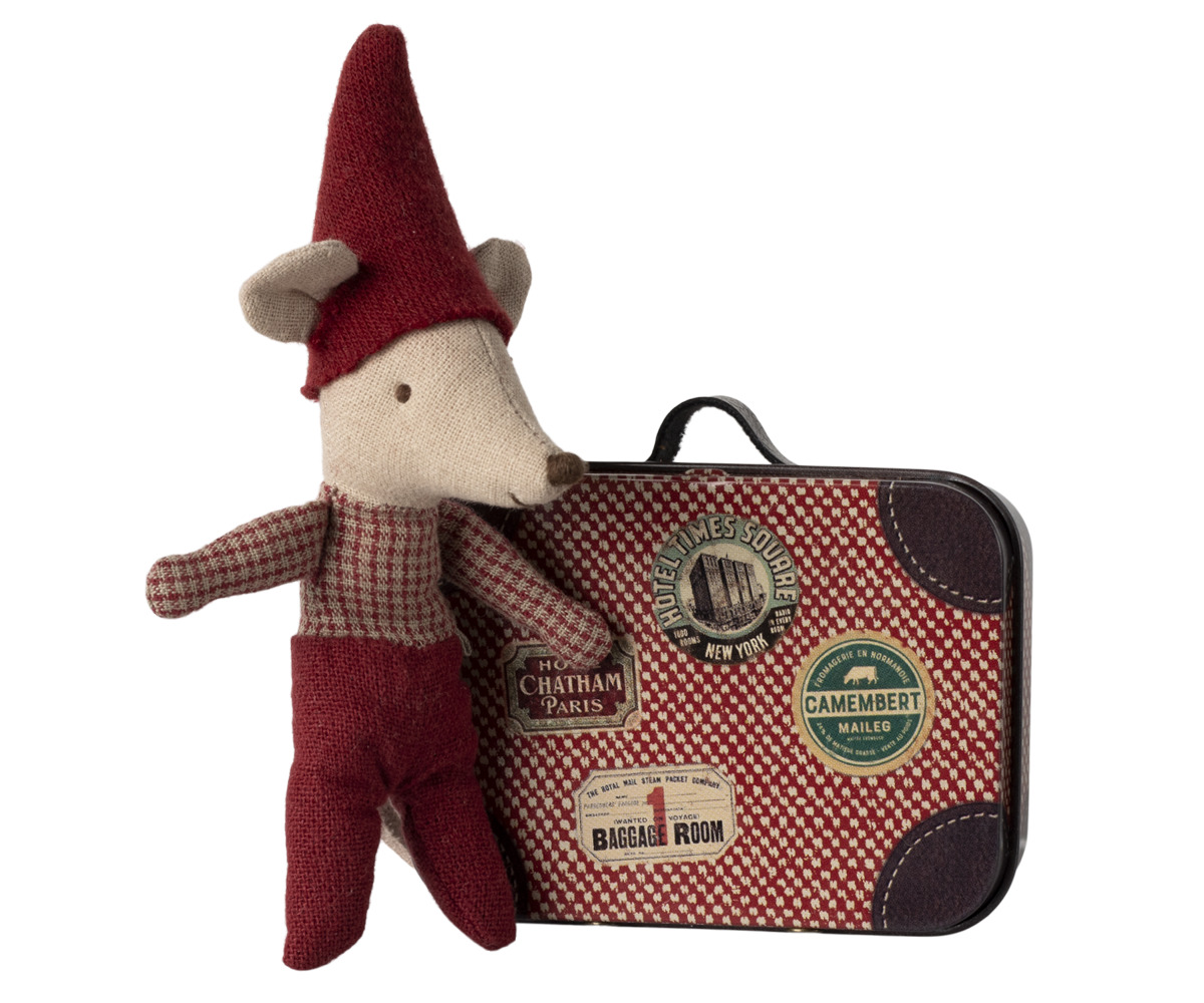 La piccola valigia da viaggio ha un contenuto speciale per questa stagione. All’interno della valigia un minuscolo topo di Natale dorme con una calda coperta.