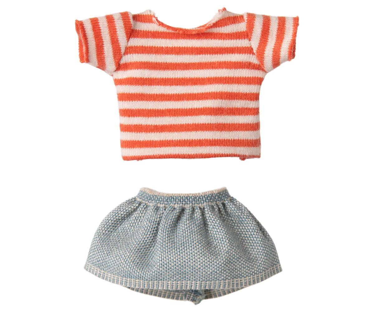 Questo topo di Maileg è la sorella di LouiMax e indossa una maglietta a righe rosse e una gonna di jeans. Ha dei magneti nelle sue mani ed è venduta in una scatola decorativa molto bella.
